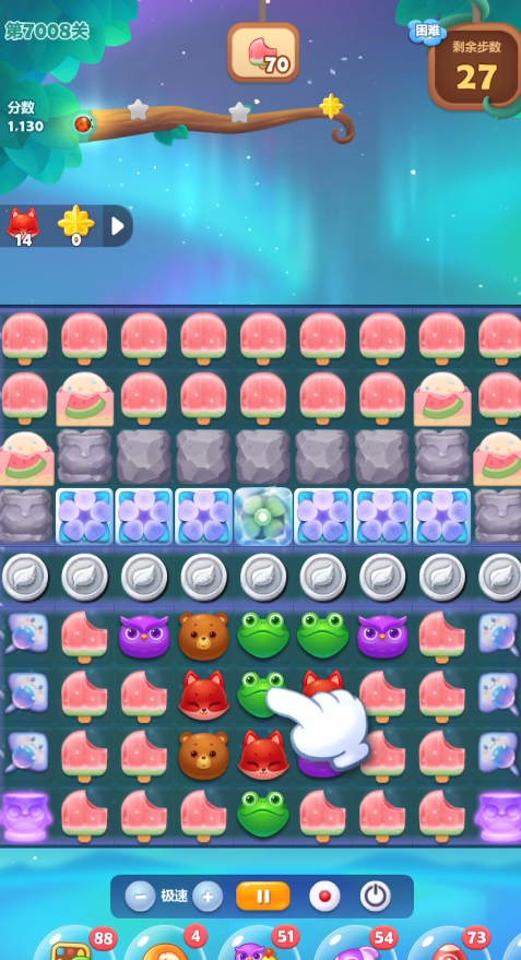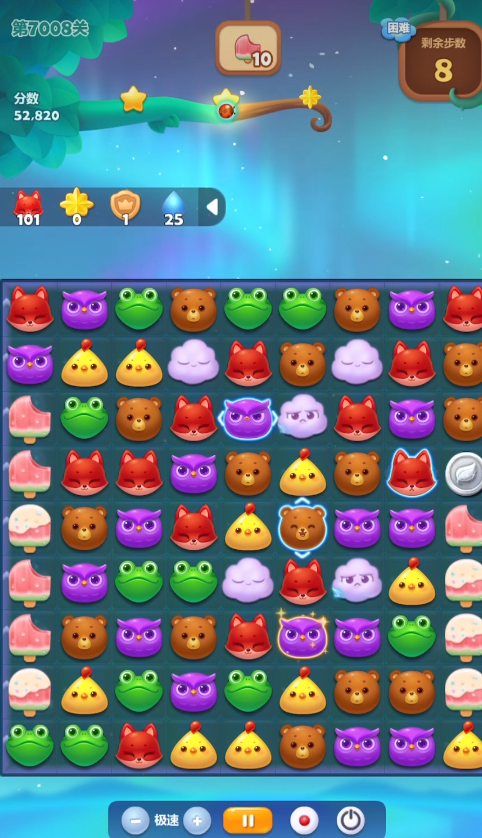 在关卡的中后期,当银币被清除大半后,就要着力于完成小金花、小熊和雪块的消除目标,这时可以多尝试组合横向、竖向的直线特效或者爆炸特效,特效之间的交换能产生更强力的清屏效果,对于角落或零散分布的剩余目标特别有效,操作时要注意观察浮梯的转动规律,预判动物下落后的位置,抓住最佳时机进行交换,每一步操作都应尽量服务于激活特效或消除关键障碍,避免无目的的移动浪费步数。